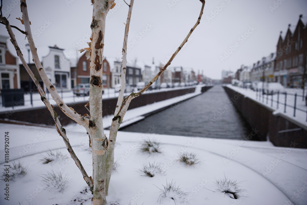 Fototapeta Winter landscape captures a serene canalside view with snow-covered surroundings