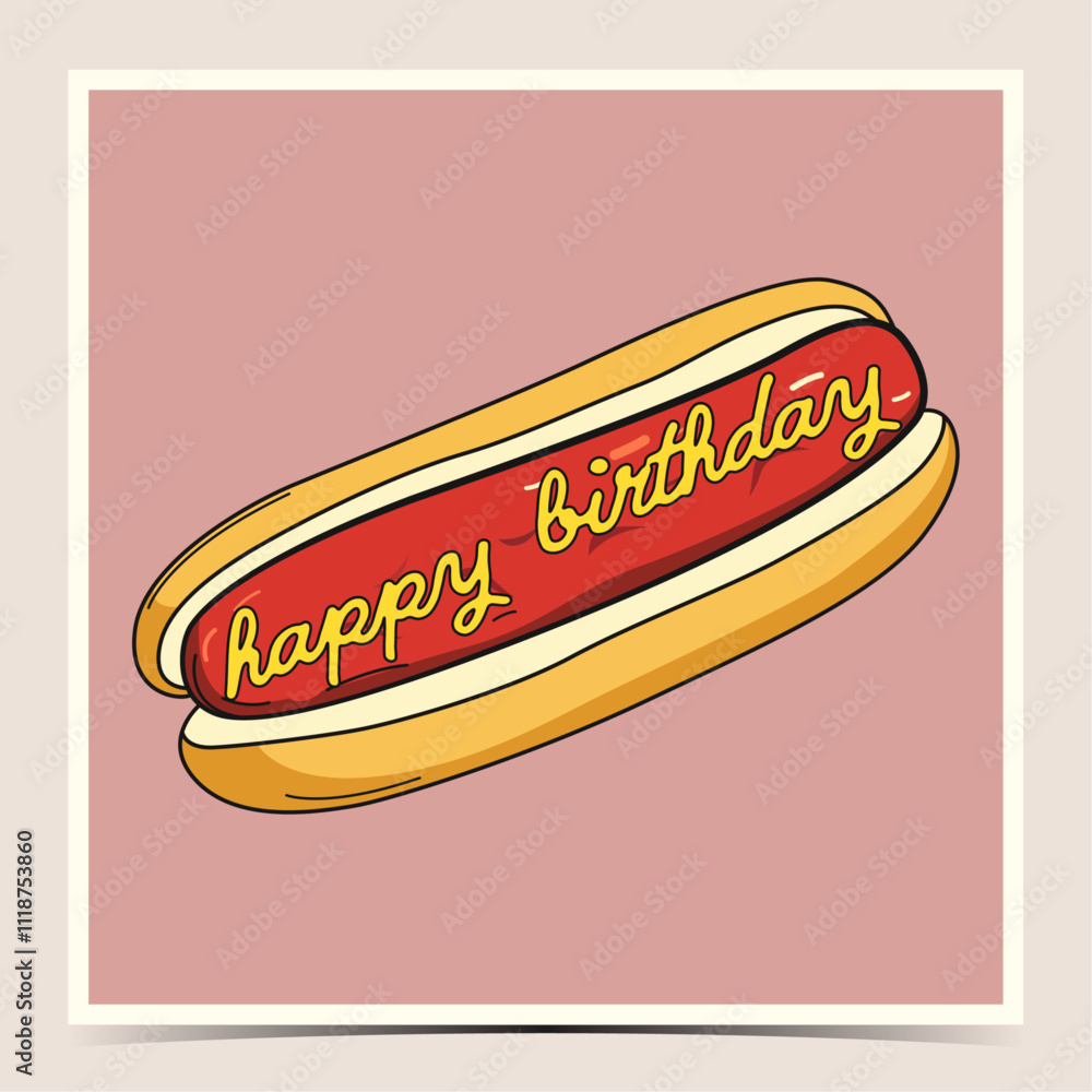 Fototapeta Funny happy birthday greeting card, poster, template, label with hot dog with mu