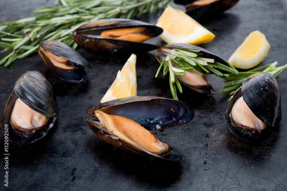 Fresh crude seafood. Mussels in a cockleshell