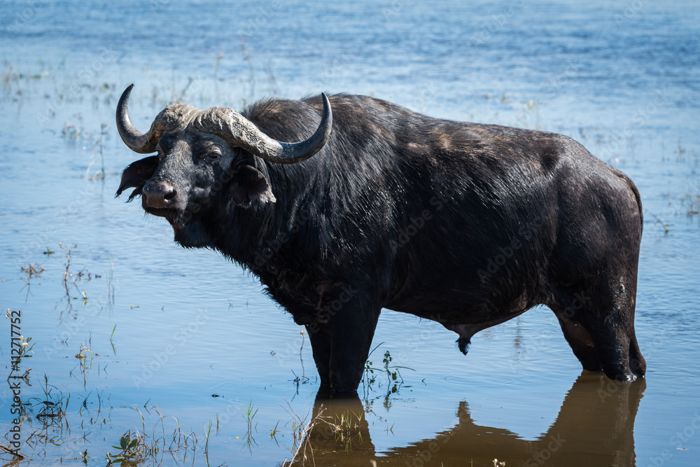 Fototapeta Cape buffalo standing in shallows facing camera
