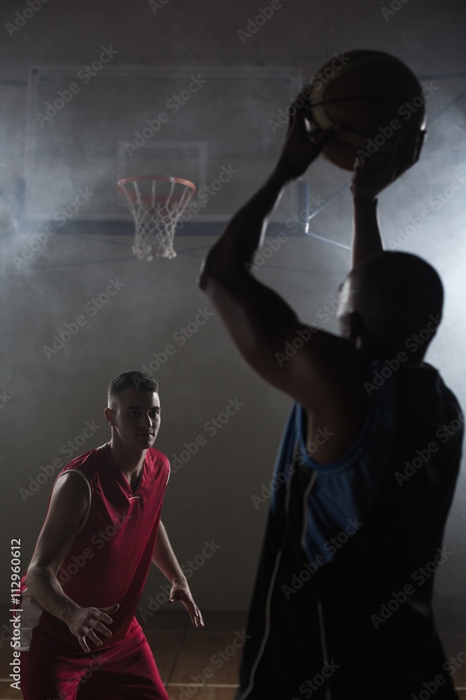 Portrait of two men playing basketball