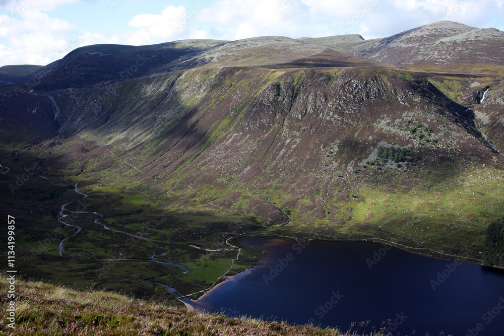 Fototapeta Trail between Broad Cairn summit, Loch Muick and Spittal of Glenmuick in the bac