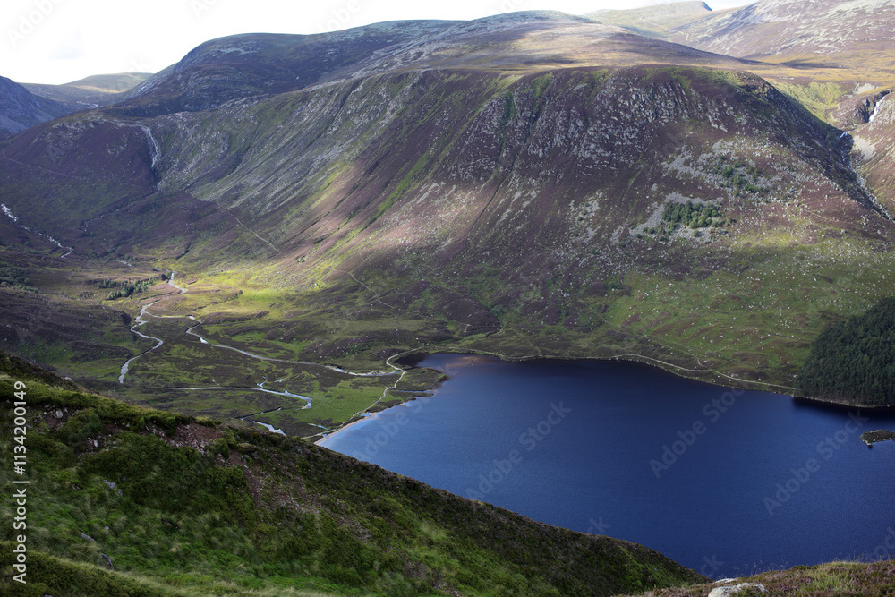 Fototapeta Trail between Broad Cairn summit, Loch Muick and Spittal of Glenmuick in the bac