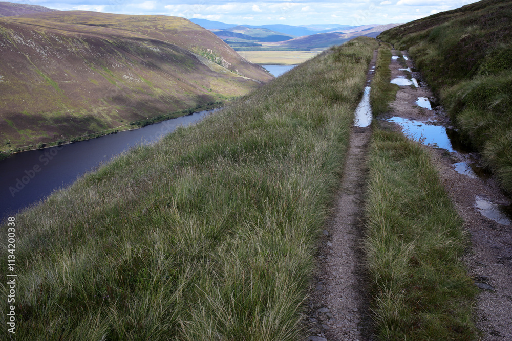 Fototapeta Trail between Broad Cairn summit, Loch Muick and Spittal of Glenmuick in the bac