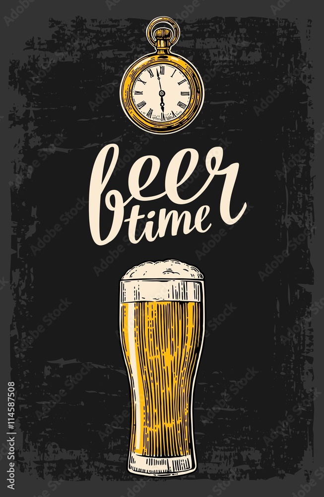 Fototapeta Mužské ruce drží sklenici piva s starožitné kapesní hodinky.
