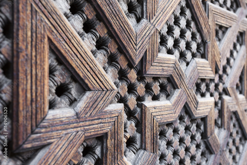 Fototapeta Beautiful hand carved wooden door in Marrakech, Morocco