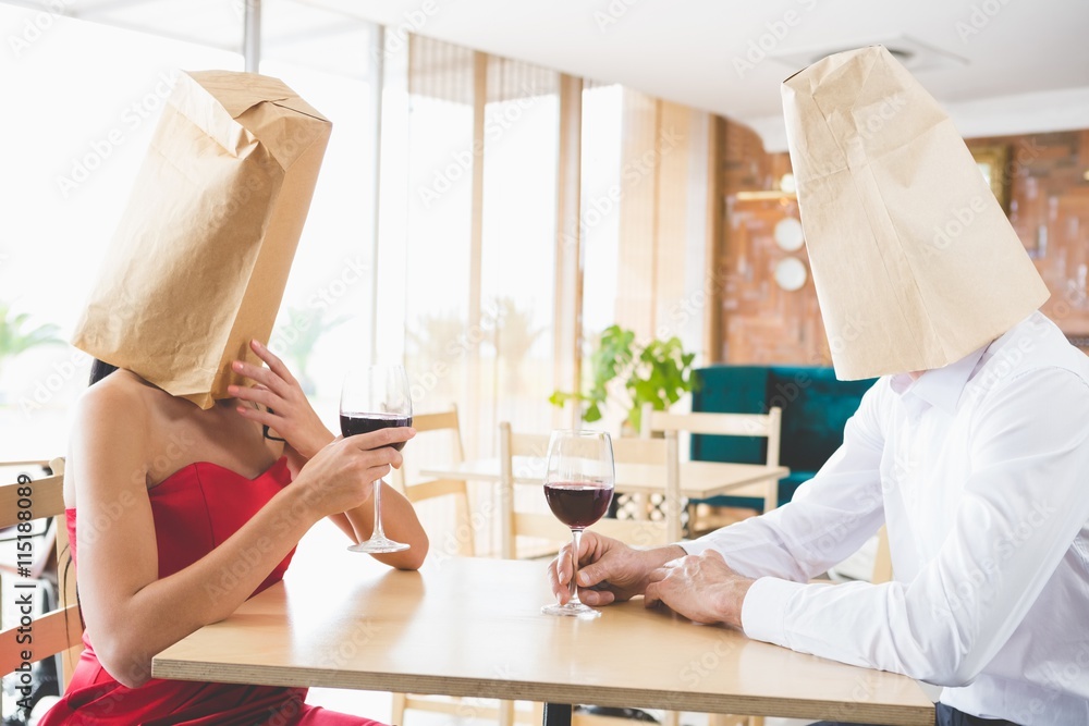 Fototapeta Couple with brown paper bags over their heads