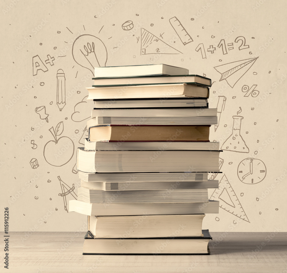 Fototapeta A pile of books on table with school hand drawn doodle sketches