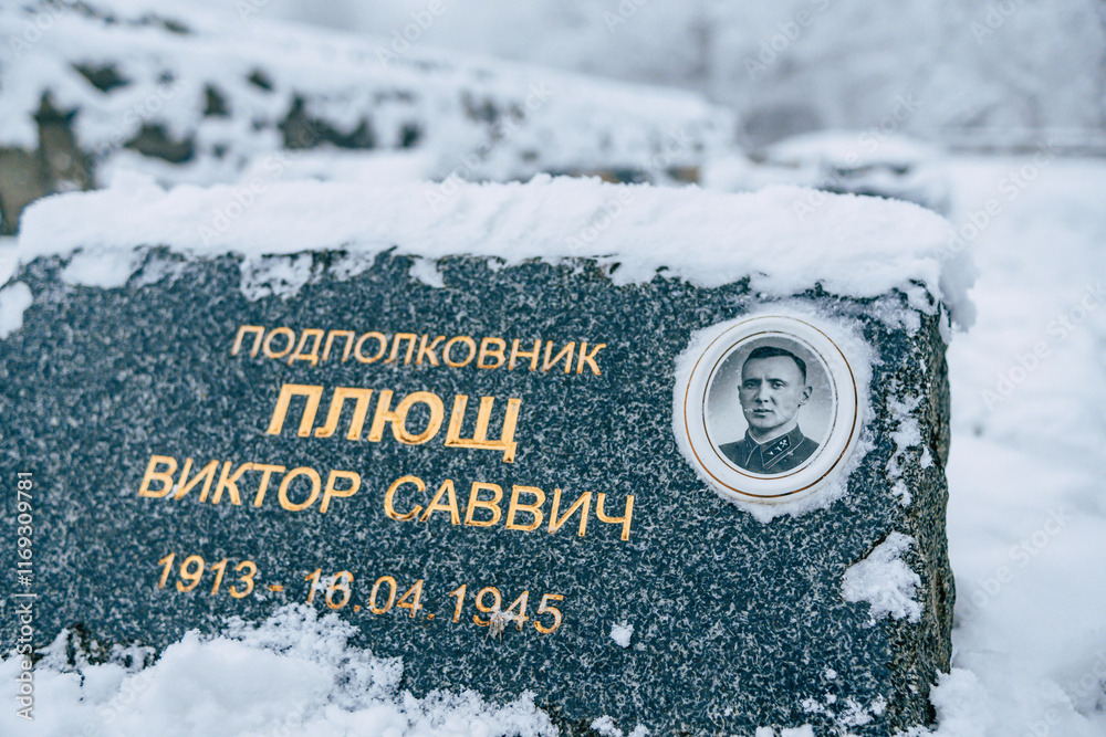 Fototapeta Slavin Second Word War memorial monument and military cemetery in snowy, foggy