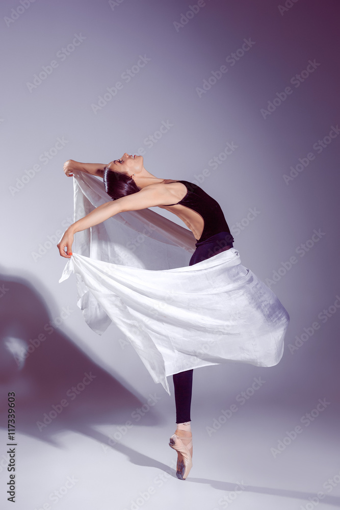 Fototapeta Ballerina in black outfit posing on toes, studio background.
