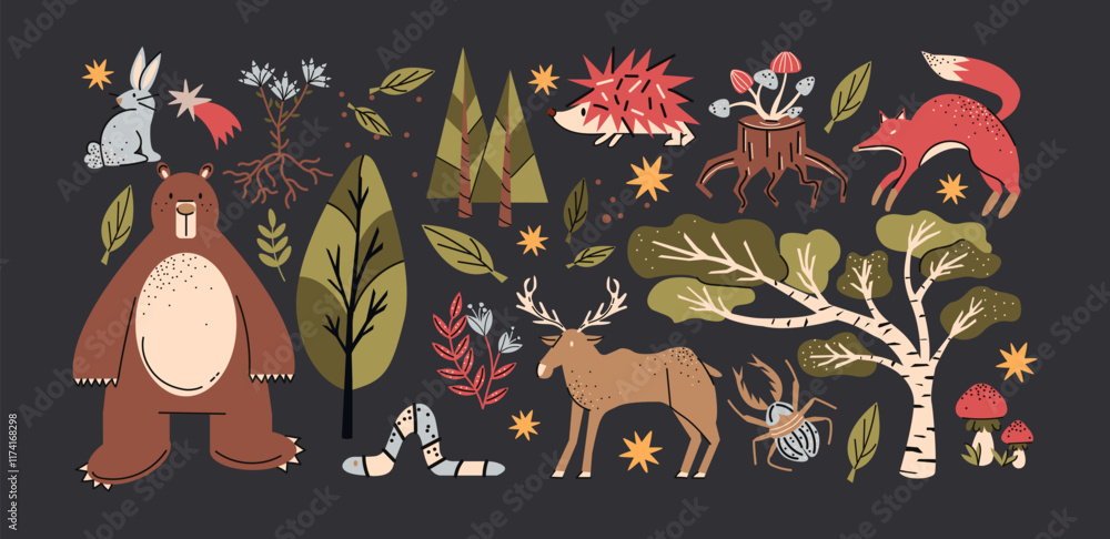 Fototapeta Mystical stickers of forest animals, plants, moon, sun