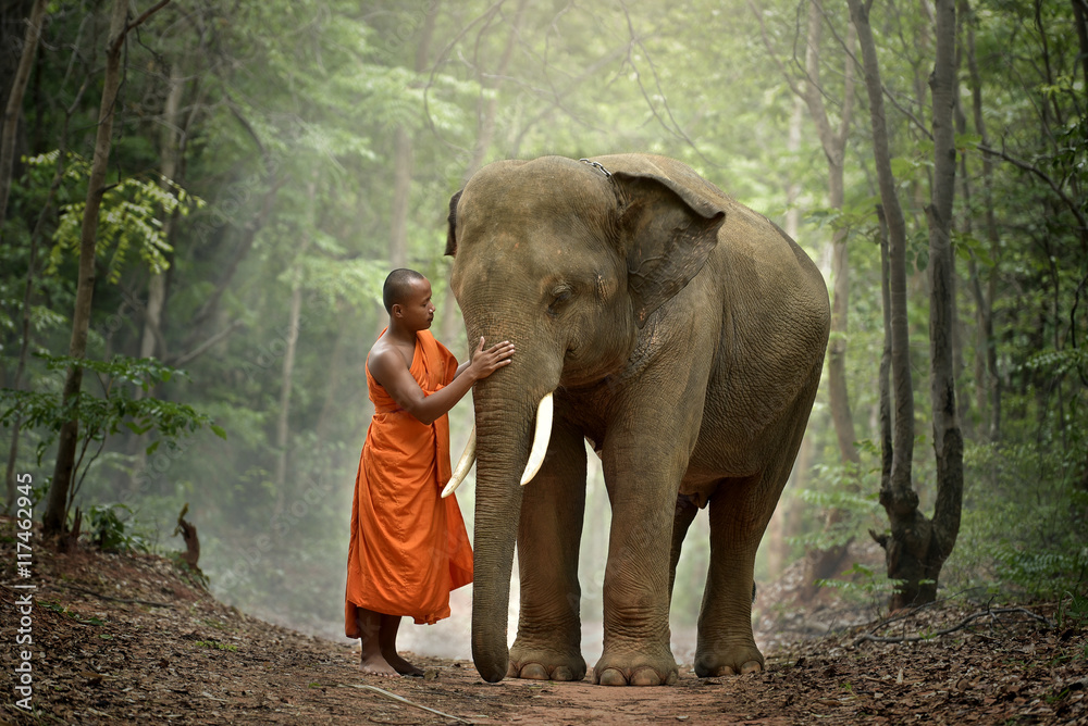 Fototapeta Buddhist monk with elephant in forest, Cambodia