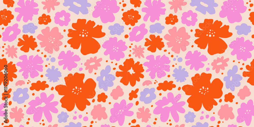 Fototapeta Vector seamless pattern in simple floral wavy and groovy naive style, flowers an