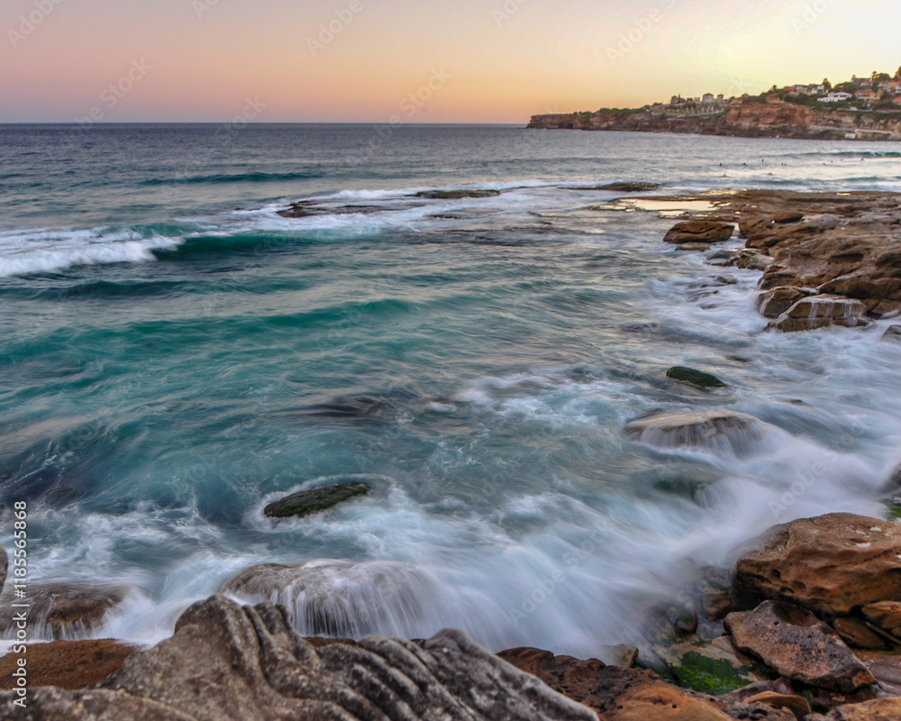 Fototapeta Waves crash into the rocks at Tamarama Point on the Sydney Coastline at sunset