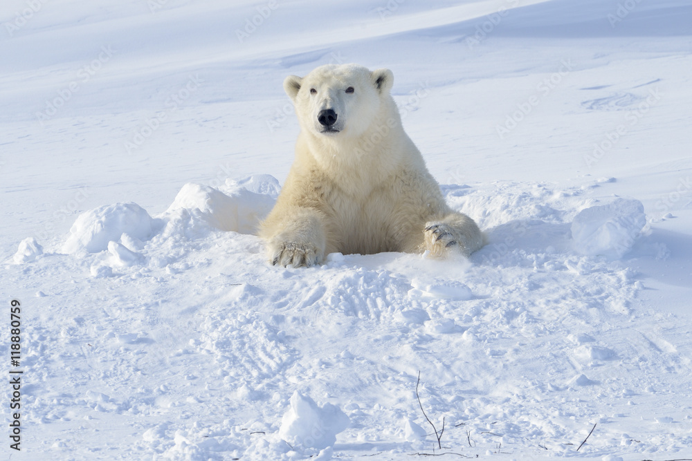 Fototapeta Polar bear (Ursus maritimus) mother coming out freshly opened den with backlight, Wapusk national park, Canada