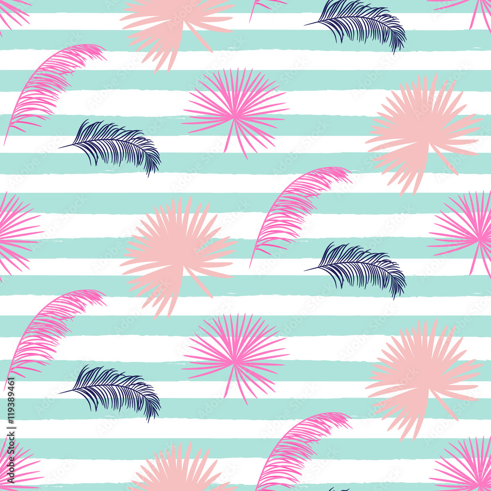 Fototapeta Pink banana palm leaves seamless vector pattern on striped blue background