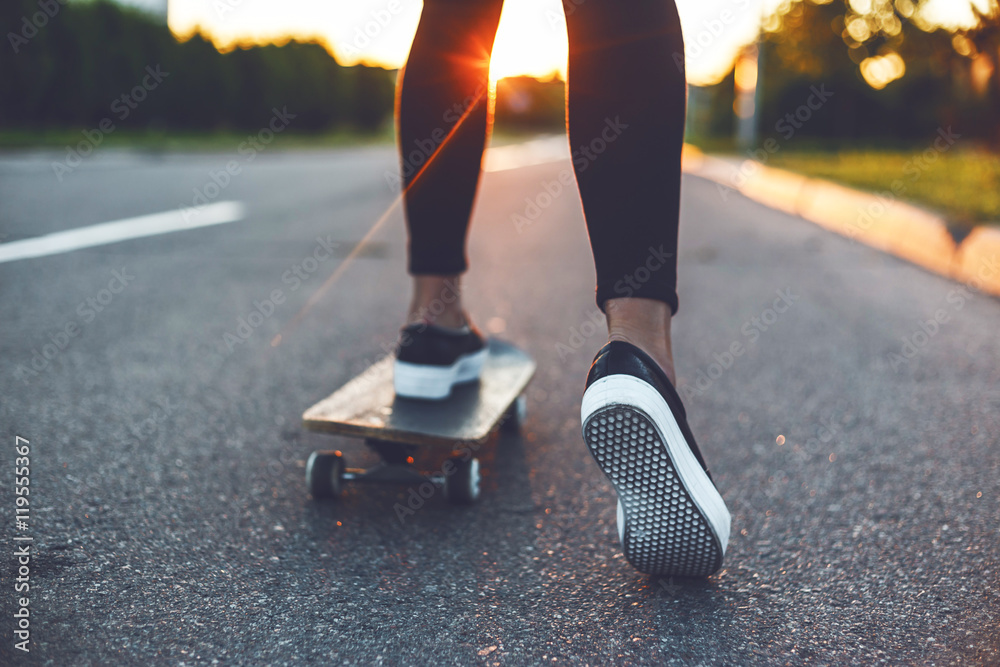 Fototapeta young skateboarder legs riding on skateboard in front of the sun