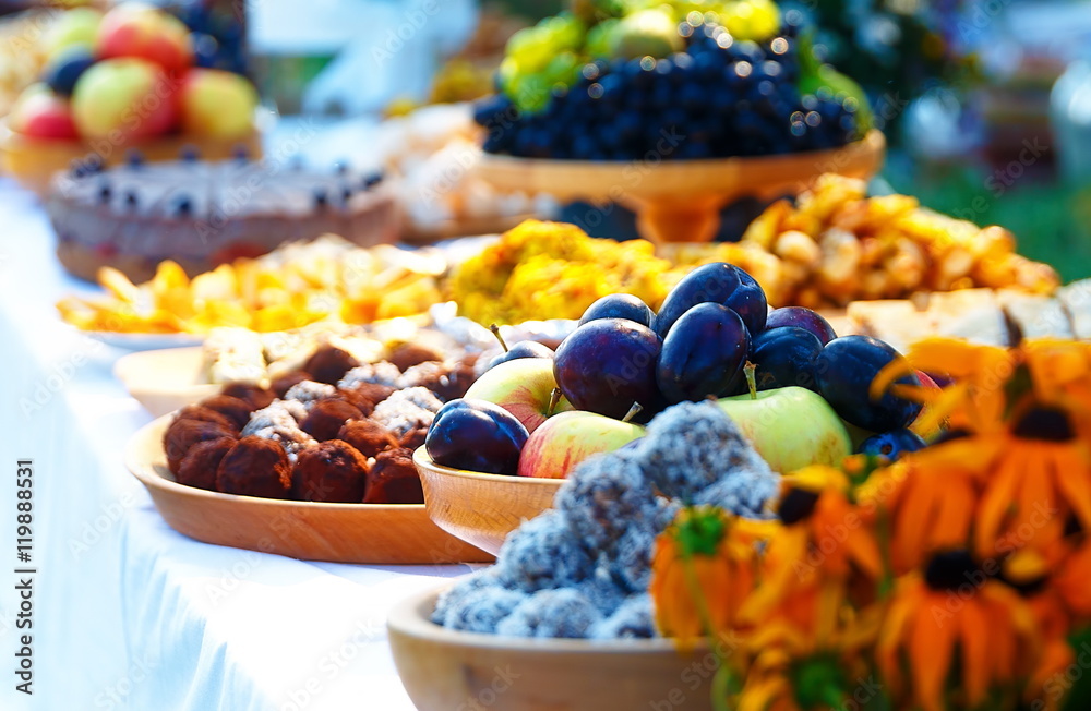 Fototapeta Beautiful wedding feast in nature, abundance of meals on a table.