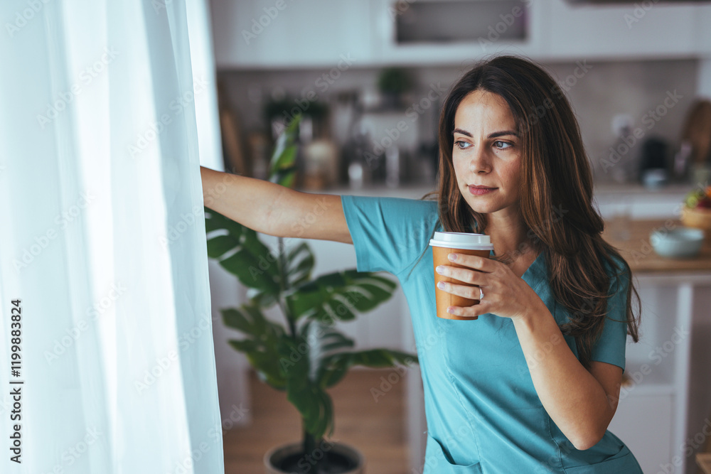 Fototapeta Contemplative Woman Holding Coffee Cup in Cozy Home Kitchen
