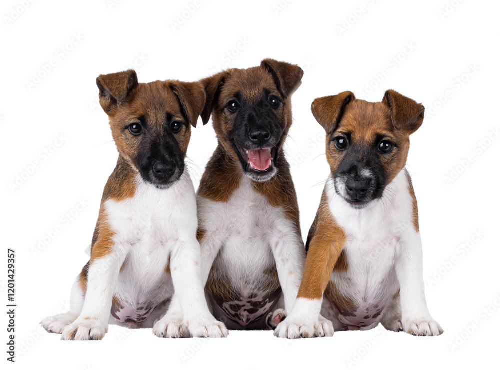 Fototapeta Three naughty smooth fox terrier dog puppies sitting facing front, next to each other on a row