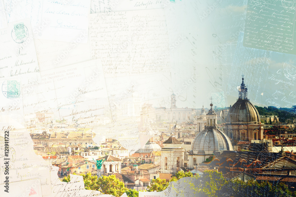 Fototapeta Vintage postcard of skyline of Rome city at day, Italy