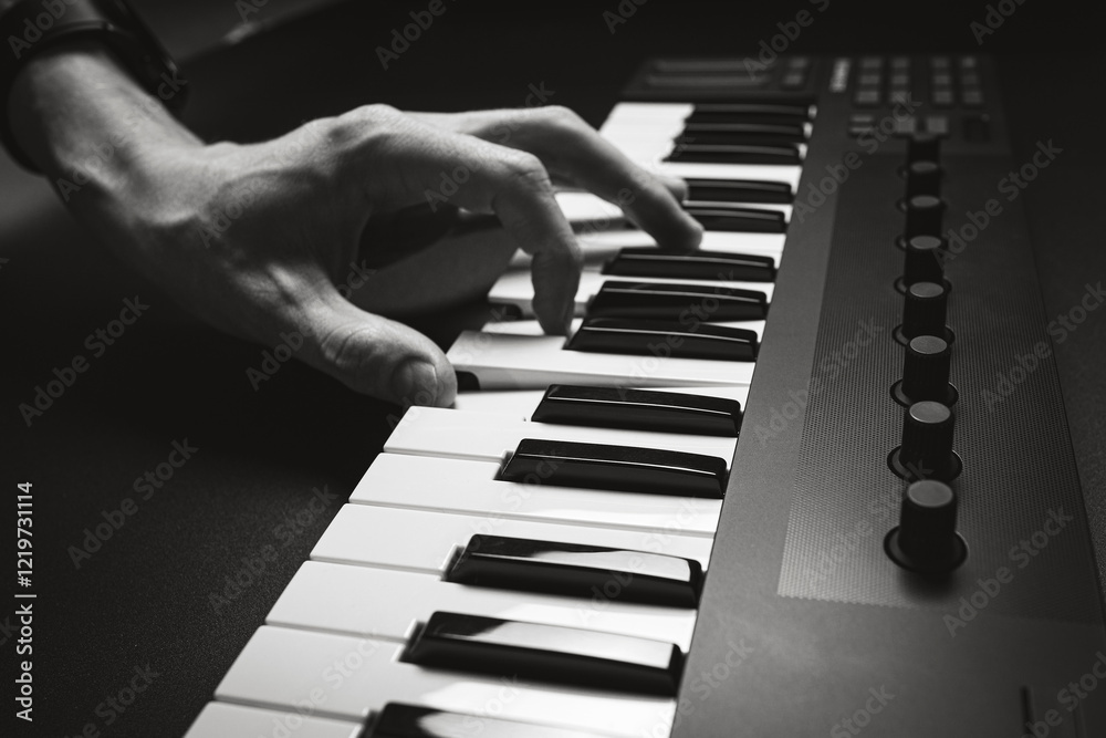 Fototapeta A midi keyboard with a man's hand playing it, piano keys.