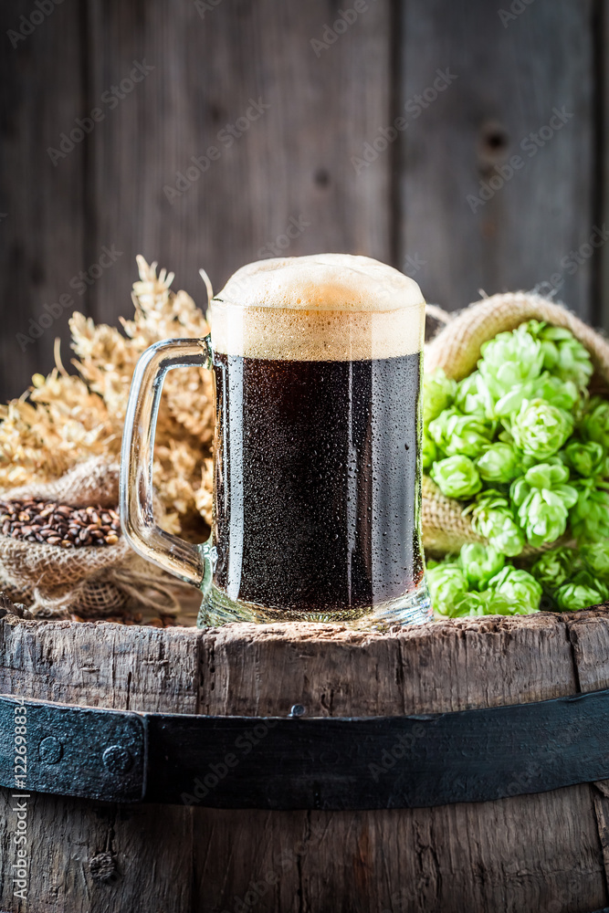 Fototapeta Pint of fresh dark beer with ingredients