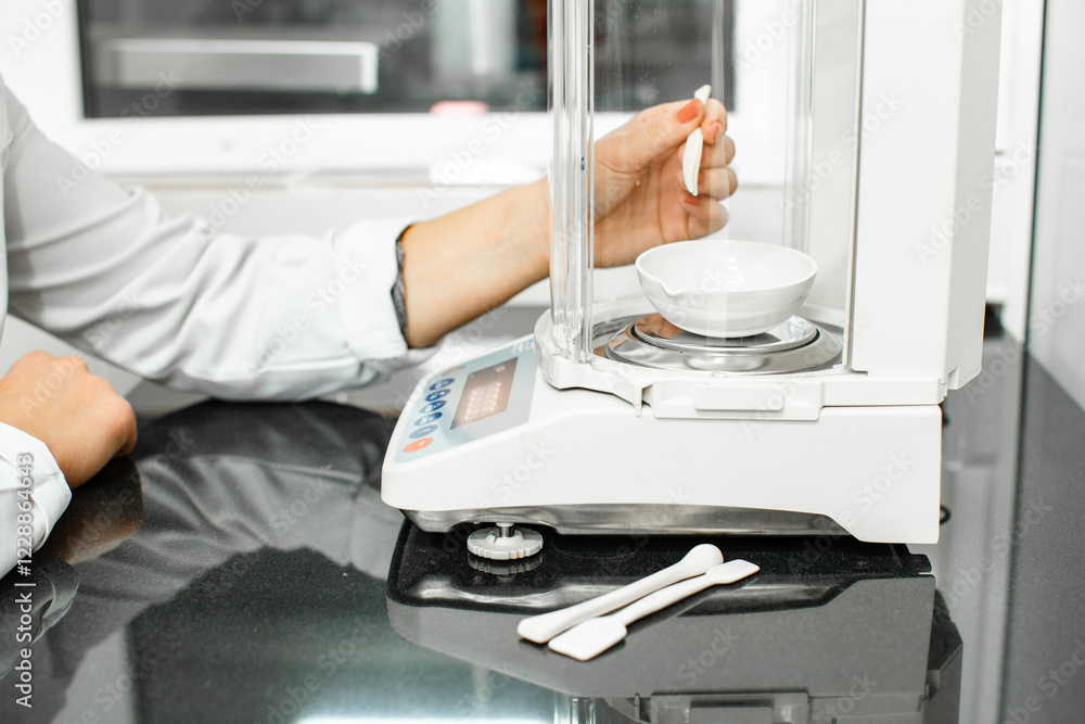 Fototapeta Precision weighing technique in a laboratory setting with a digital balance and