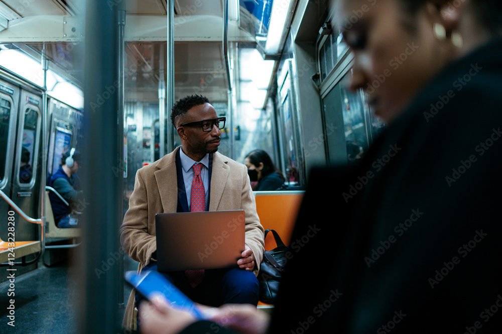 Fototapeta Businessman working on laptop on subway commuting home