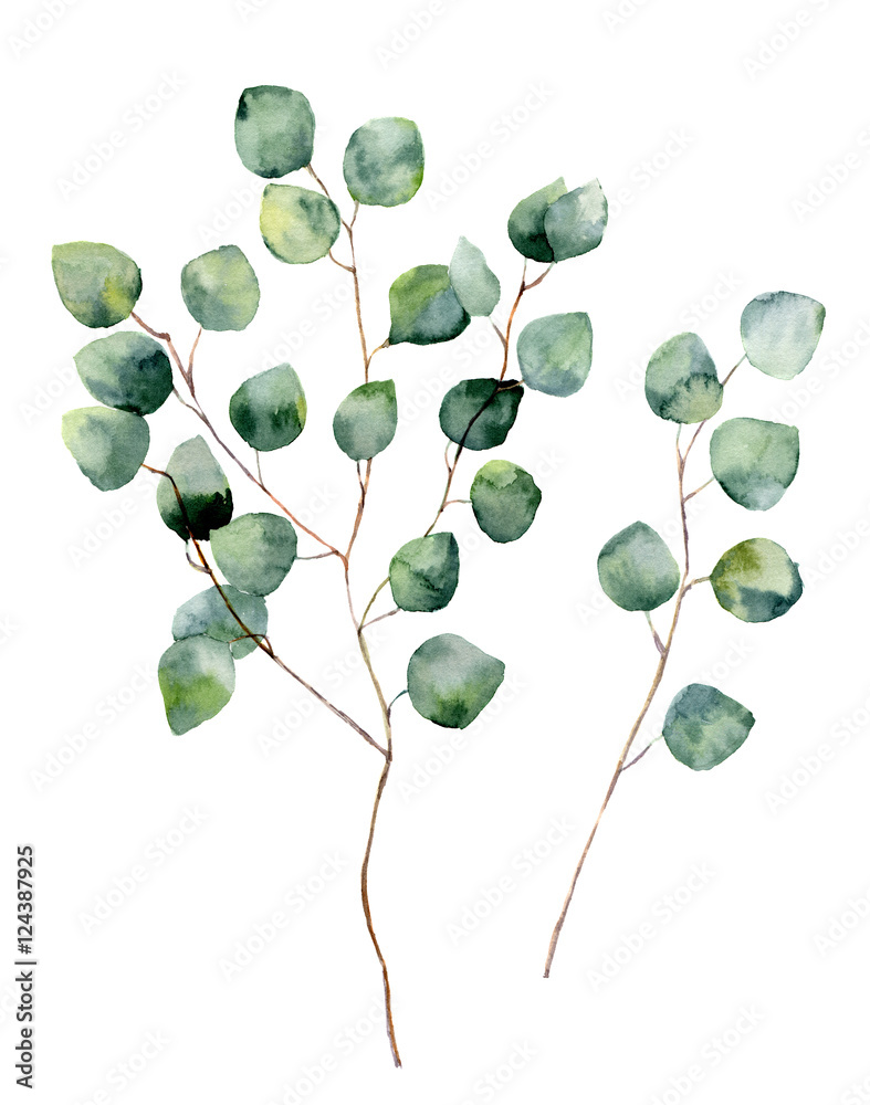 Fototapeta Watercolor silver dollar eucalyptus with round leaves and branches
