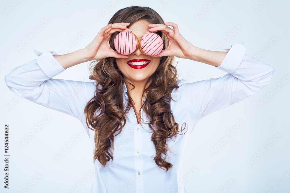 Fototapeta Smiling woman holding cake close up portrait.