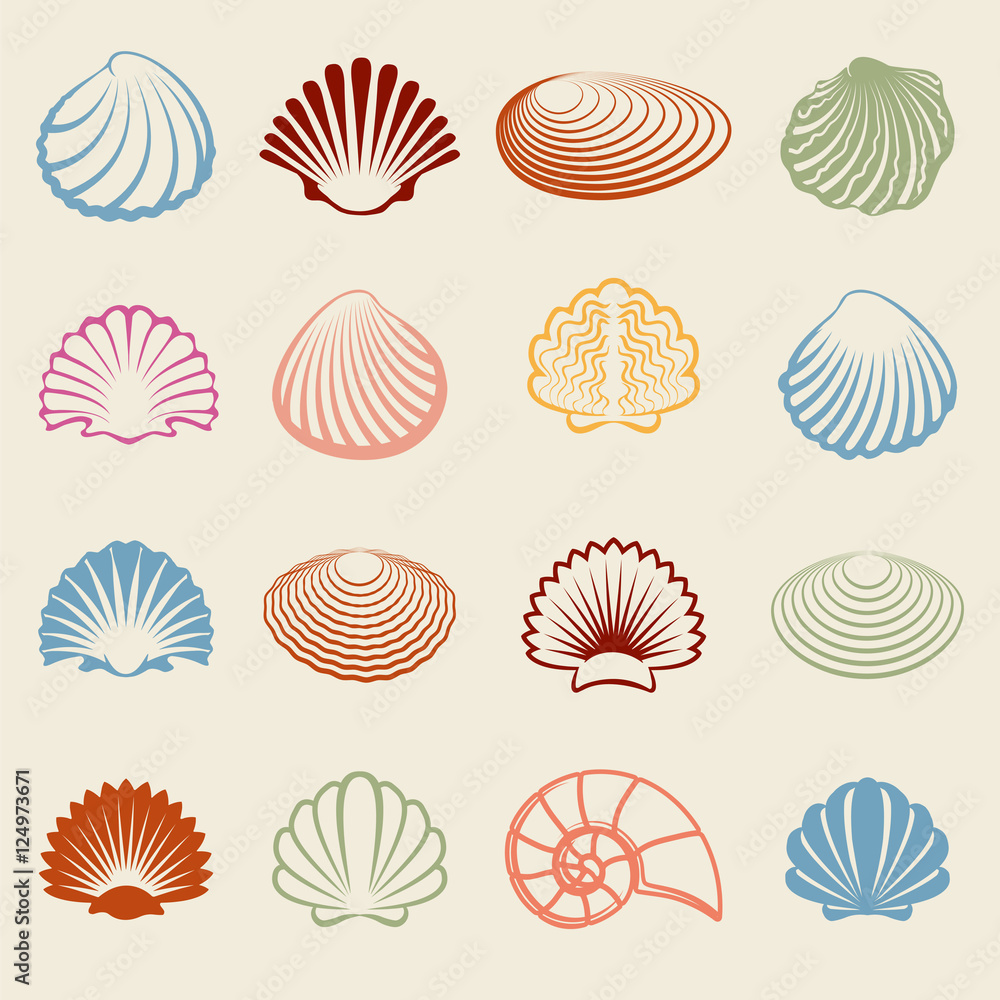 Fototapeta Colorful sea shells silhouettes set on white bckground
