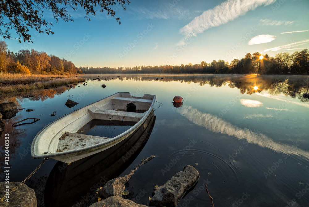 Fototapeta Calm lake with rowboat in autumn scenery