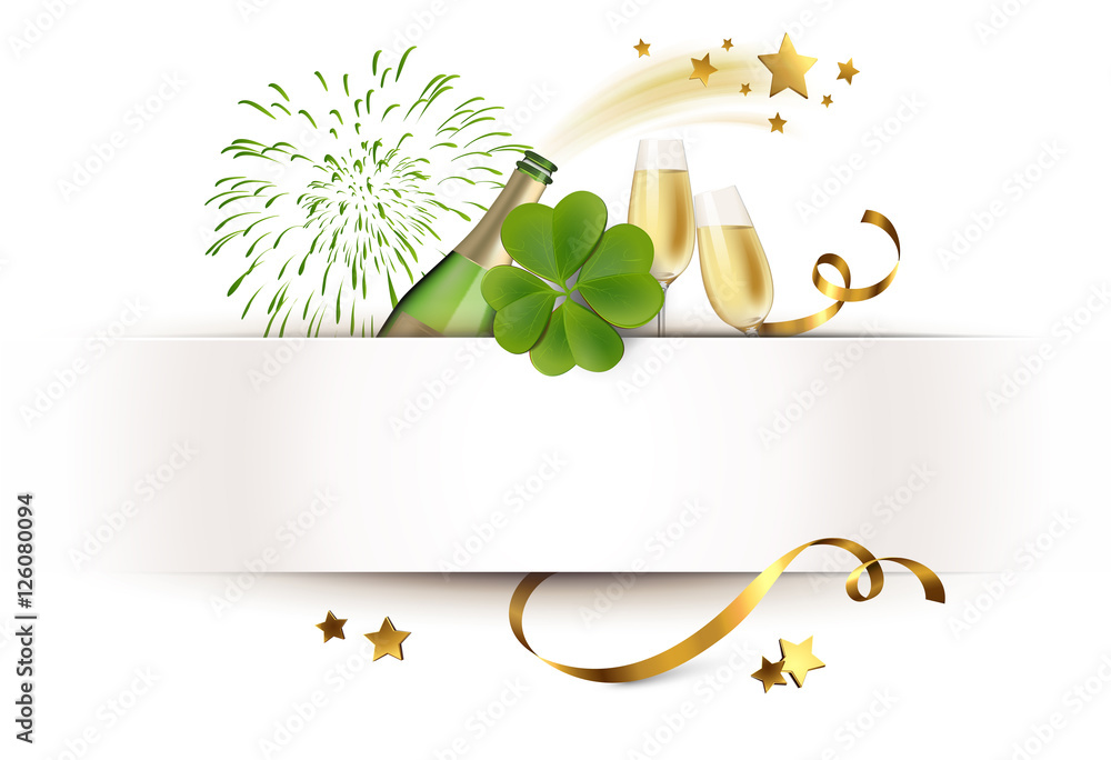 Fototapeta Silvester Banner mit Neujahrsmotiven - Feuerwerk, Sektflasche, Kleeblatt, Sektgl