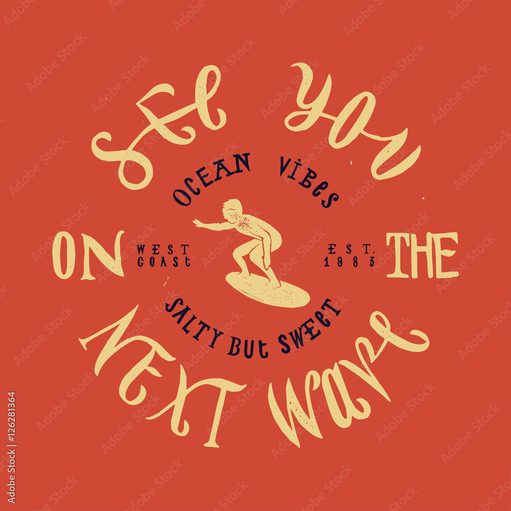 Fototapeta surfing round stamp print with a surf rider silhouette