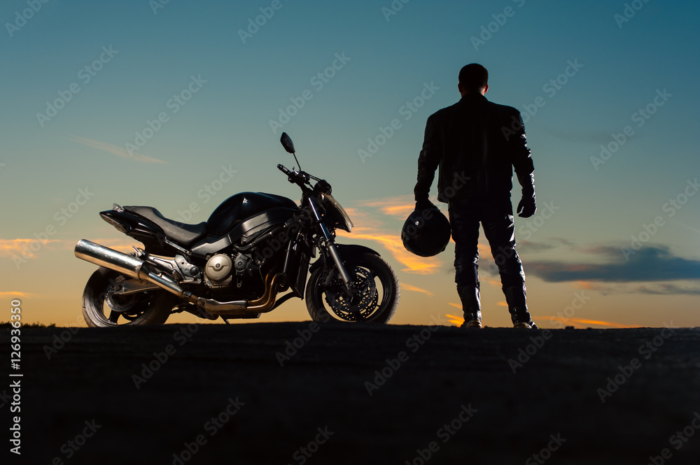 Fototapeta Silhouette of man in leather outfit with motorbike