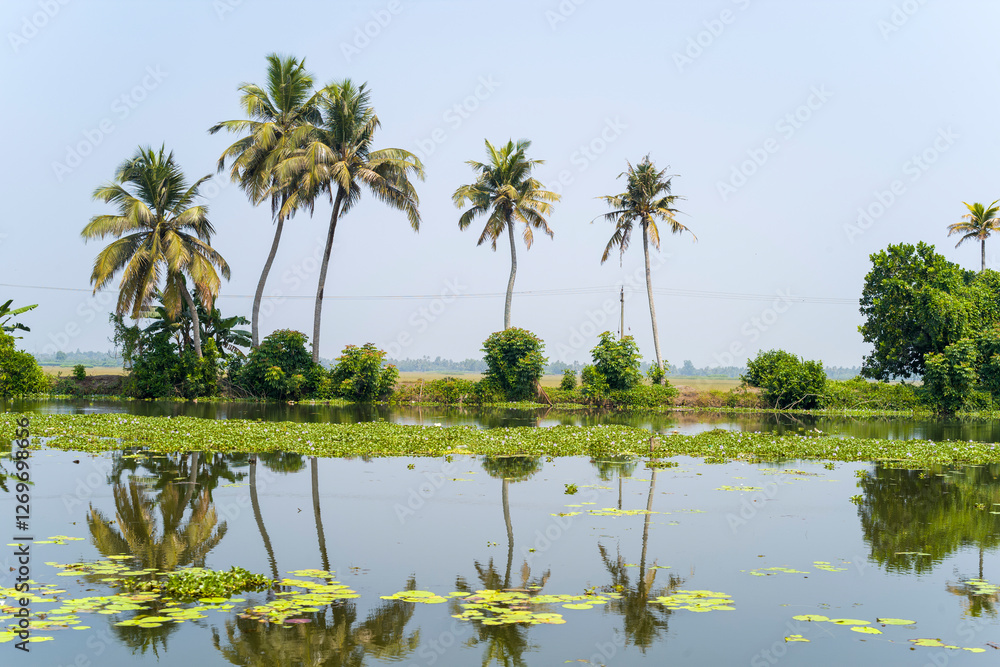 Fototapeta Palm trees in the backwaters of Alappuzha in Asia, India, Kerala, Alleppey, in summer, on a sunny day