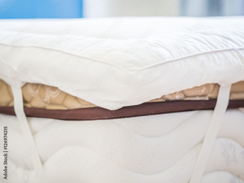 Fototapeta Closeup of white topper on the bed in the bedroom