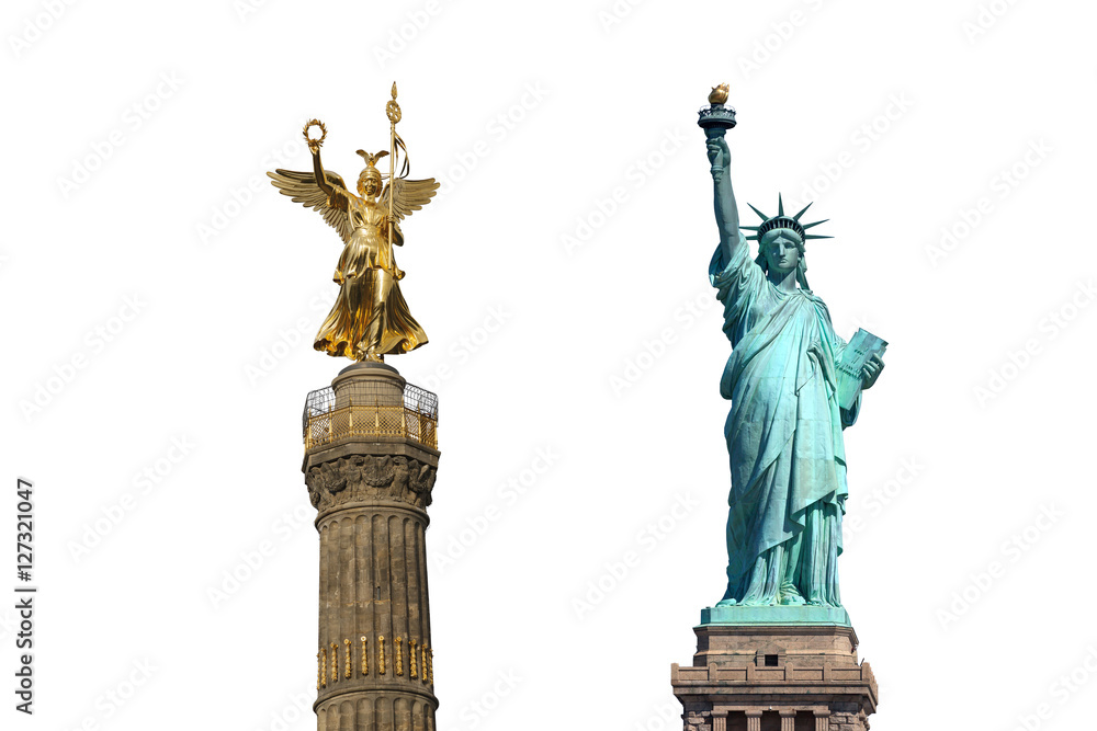 Fototapeta Siegessäule Berlin und Freiheitsstatue New York City freigestellt vor weiß