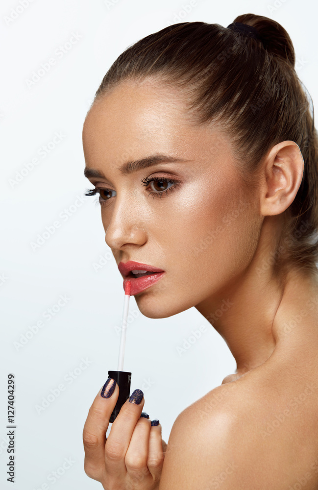 Fototapeta Beautiful Woman Doing Makeup Using Lip Gloss On Lips. Cosmetics