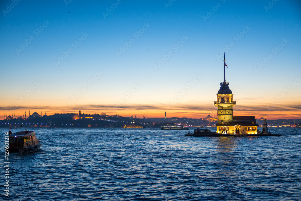 Fototapeta sundown views to istanbul lighthouse and skyline, turkey