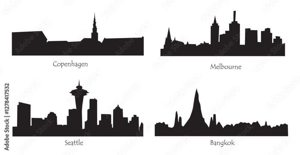 Fototapeta Set of skyline silhouettes of different modern cities, Copenhagen, Melbourne, Seattle, Bangkok