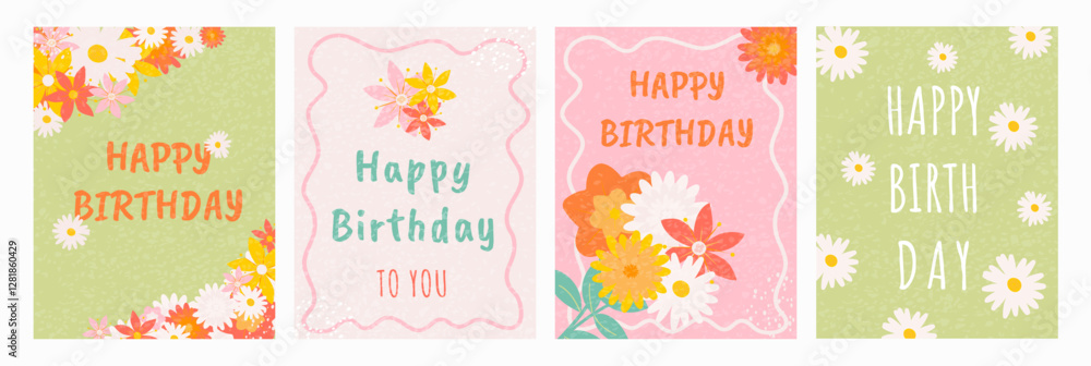 Fototapeta Hand drawn set of cutest cards or posters for Birthday with Flowers, bouquet and Texture