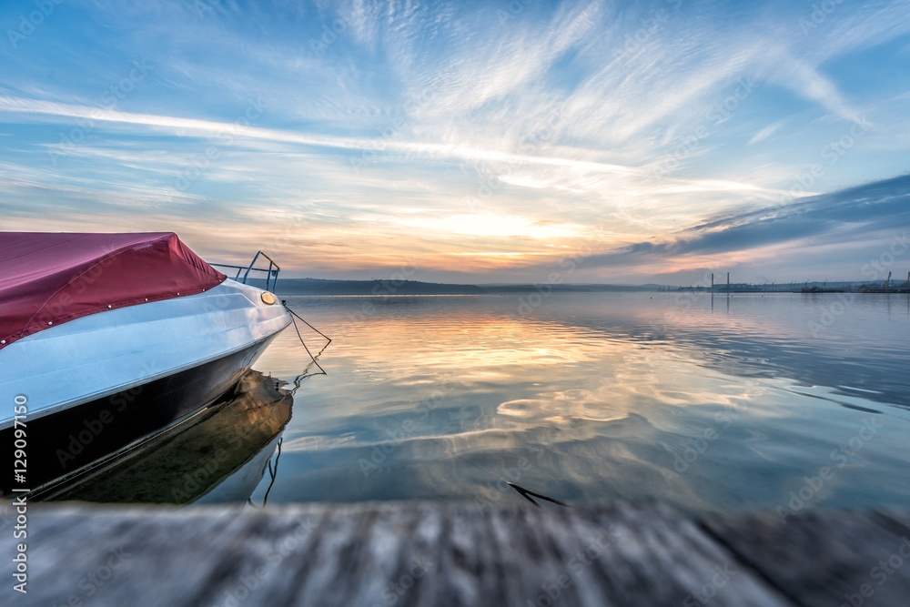Fototapeta Boat near to a pier at sunset time