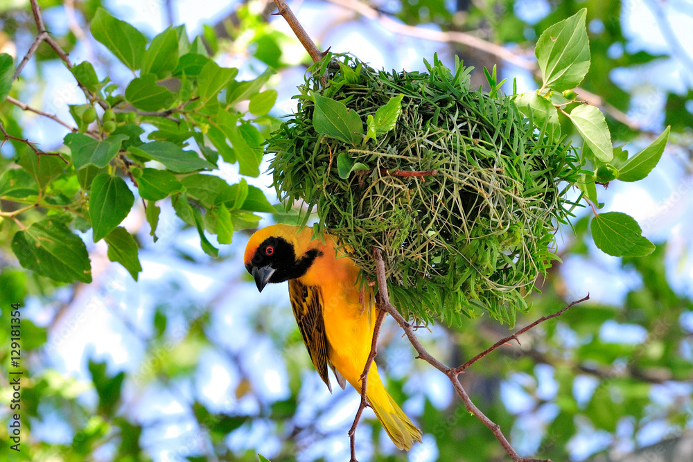 Fototapeta Southern masked weaver building its nest