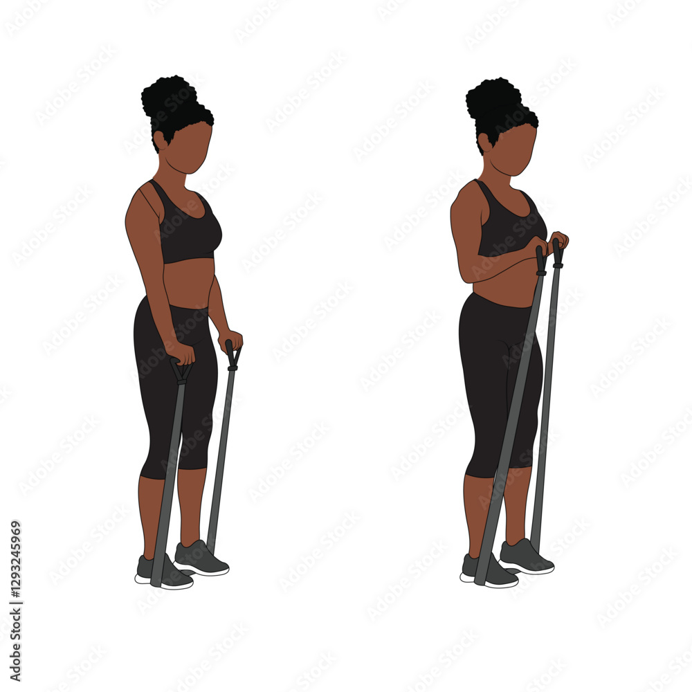 Fototapeta A Black African woman in black clothing doing reverse bicep curls with resistance bands exercise