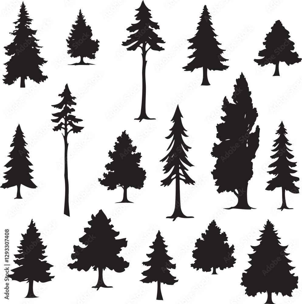 Fototapeta set of vector coniferous trees, black and white illustration, trees silhouettes