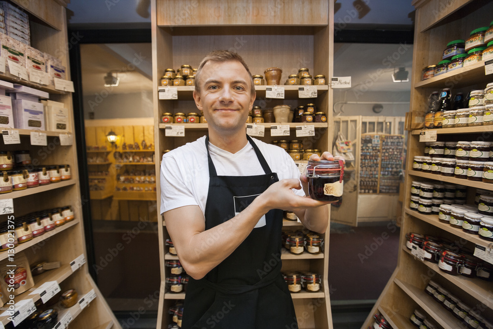 Fototapeta Portrait of mid adult salesman holding jar of jam in grocery store