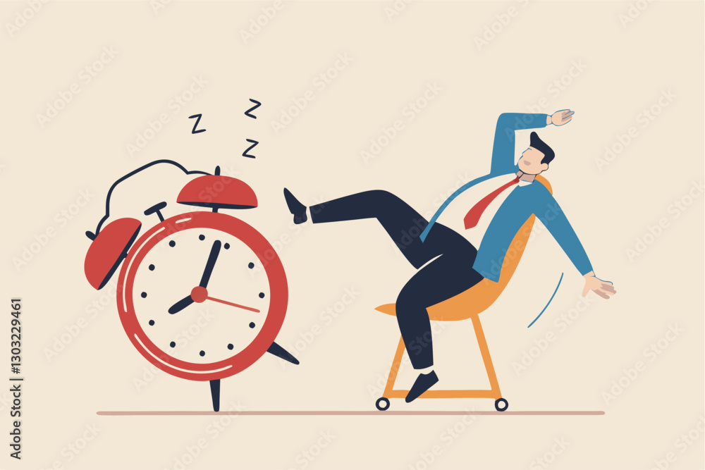 Fototapeta Afternoon slump, laziness and procrastination postpone work to do later, boredom and sleepy work concept, businessman sleeping lay down on office chair and alarm clock covered his face with book