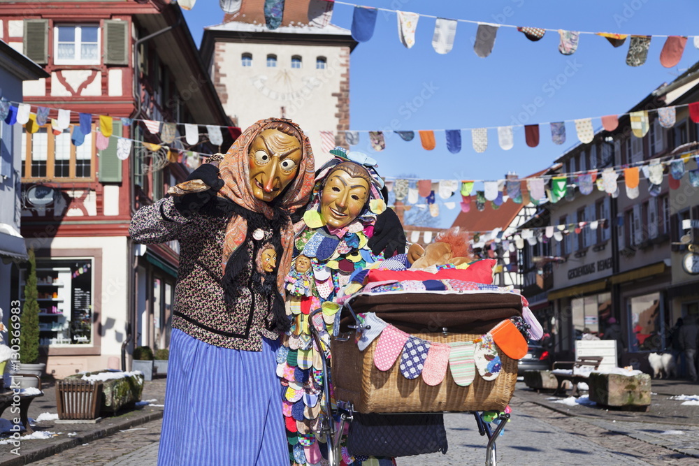 Fototapeta Couple in traditional costumes of Witch and Spattleshansel with a buggy, Swabian